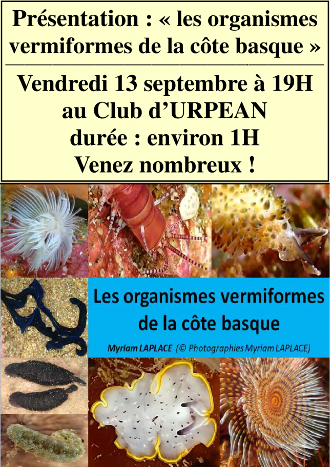 Vendredi 13 et oui cela porte chance donc en ce vendredi 13 septembre se tiendra au club Urpean à 19 h dans la salle du txoko une présentation organisée par Myriam Laplace sur les organismes vermiformes de la côte basque.
