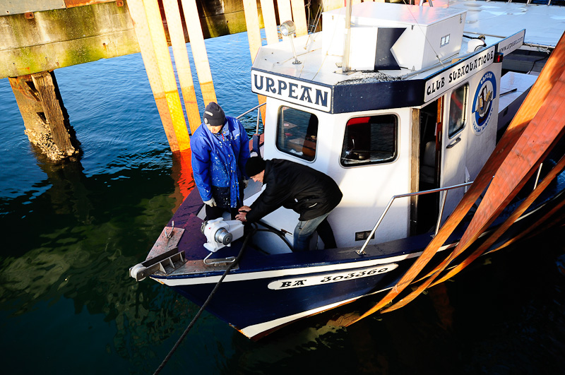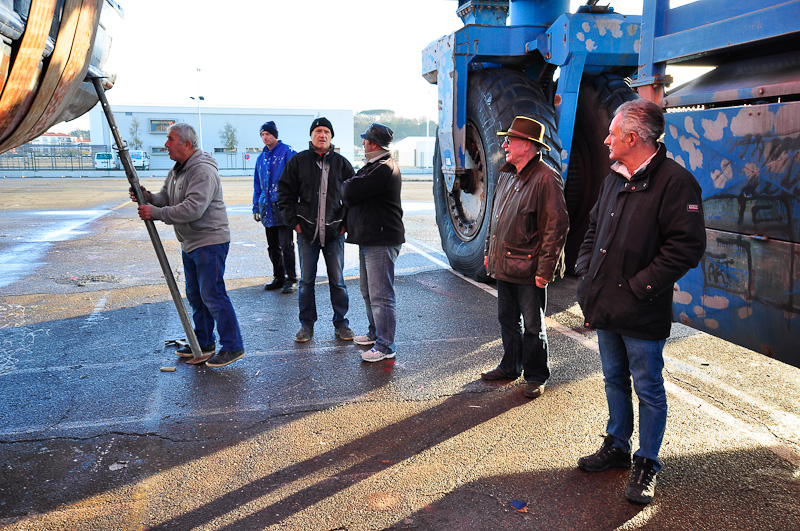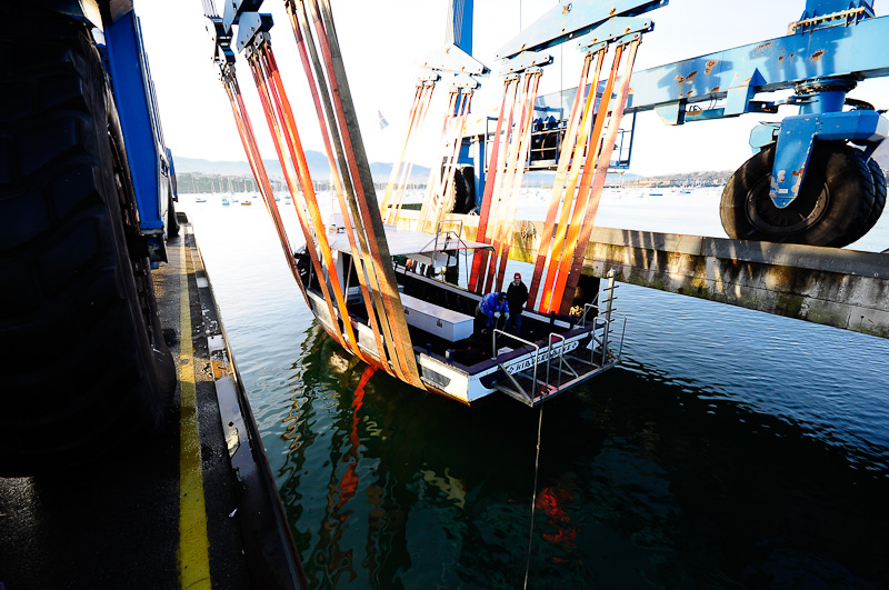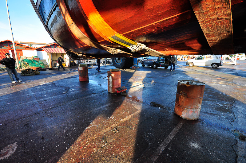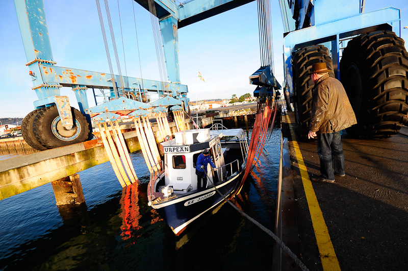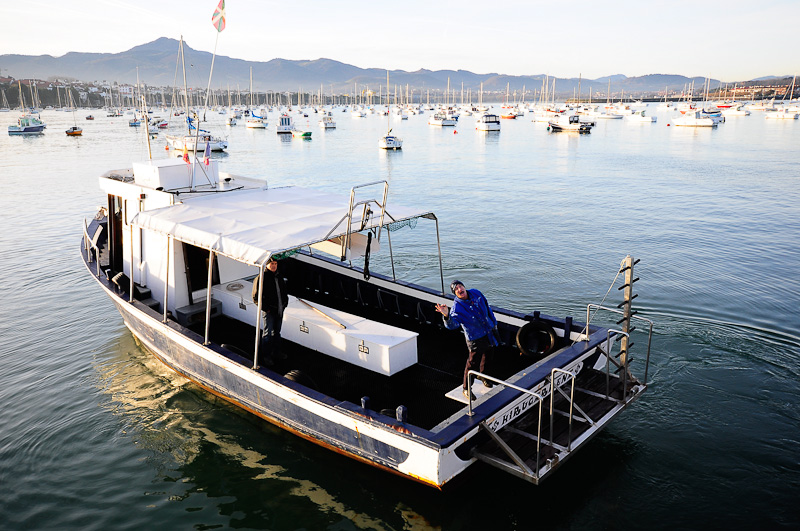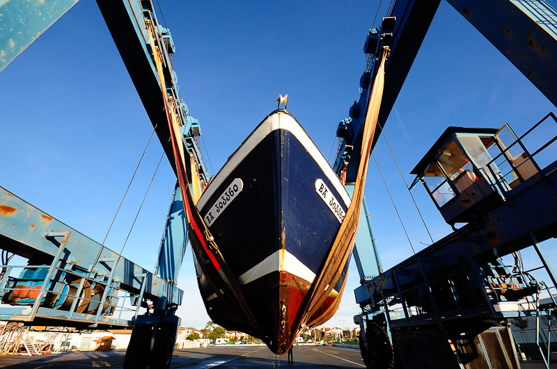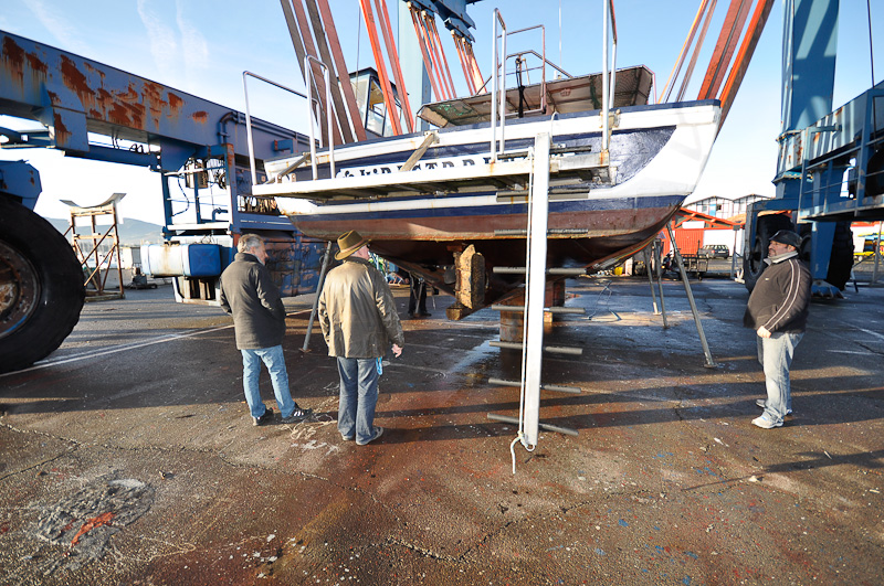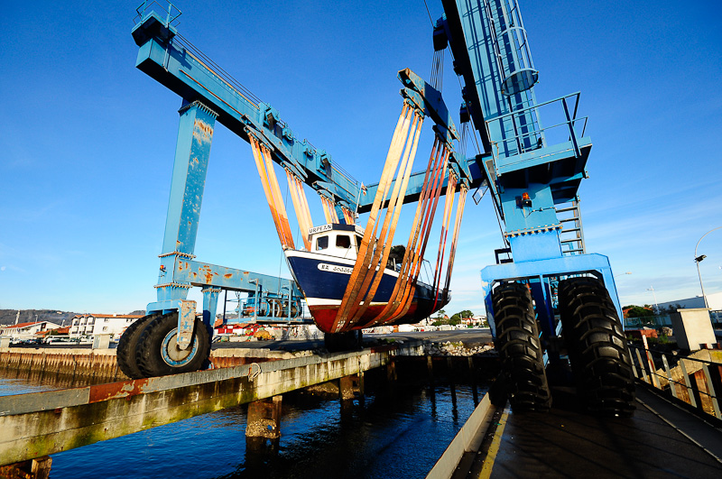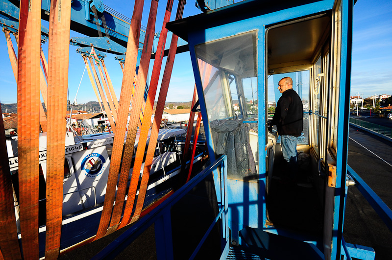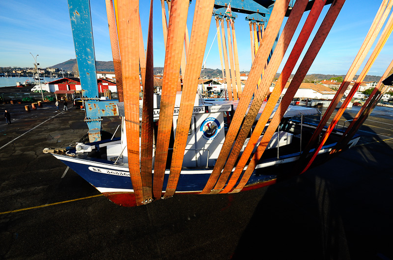 Hier matin 9 janvier Eric, Mitch, Benat, Jean-Michel, Papou, Ulrich et moi avons transféré L’Hirugarrena du port de plaisance à la zone technique.