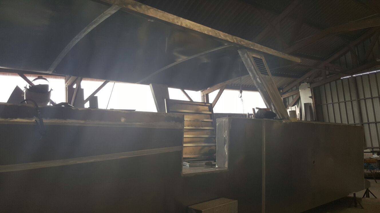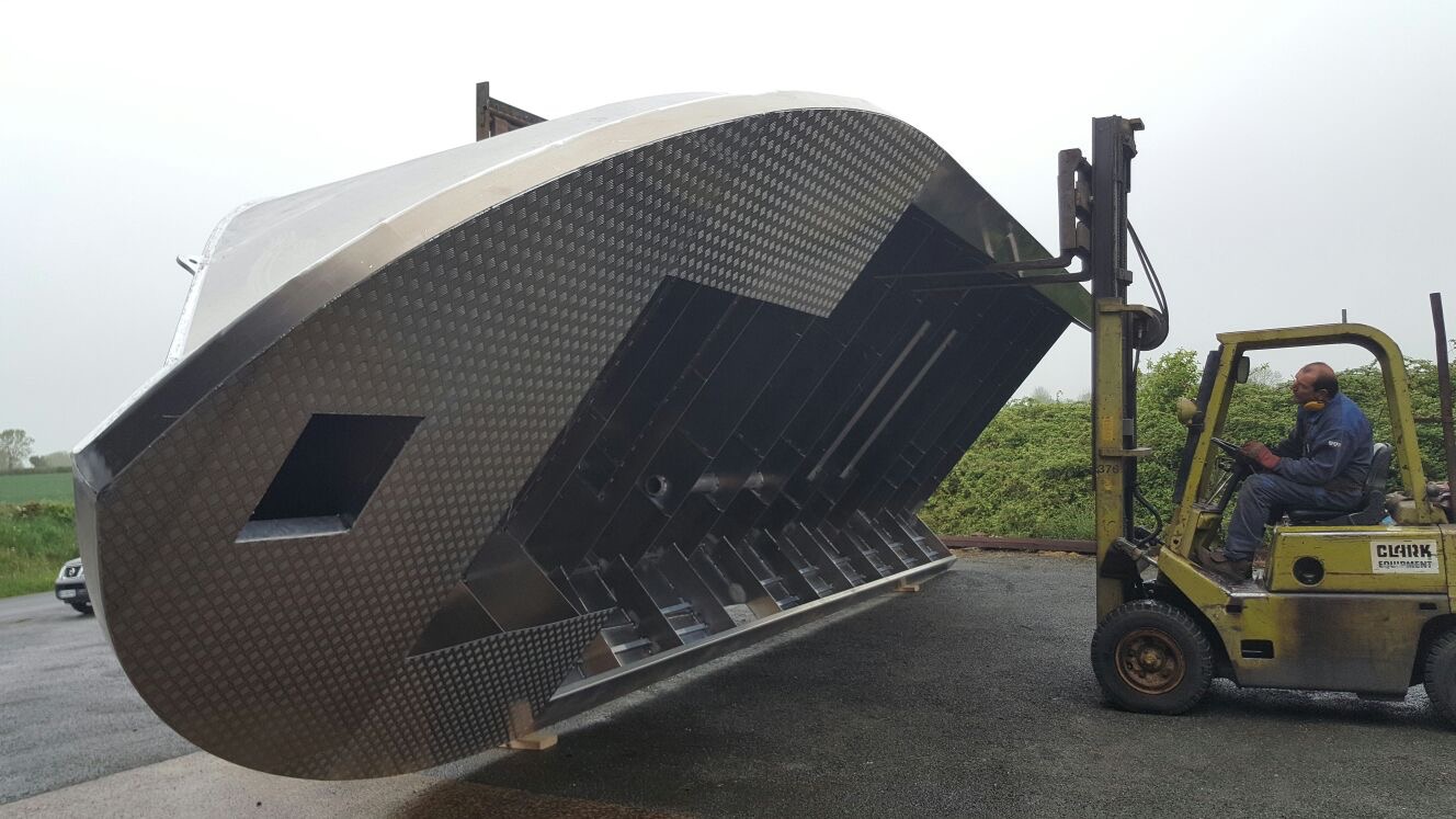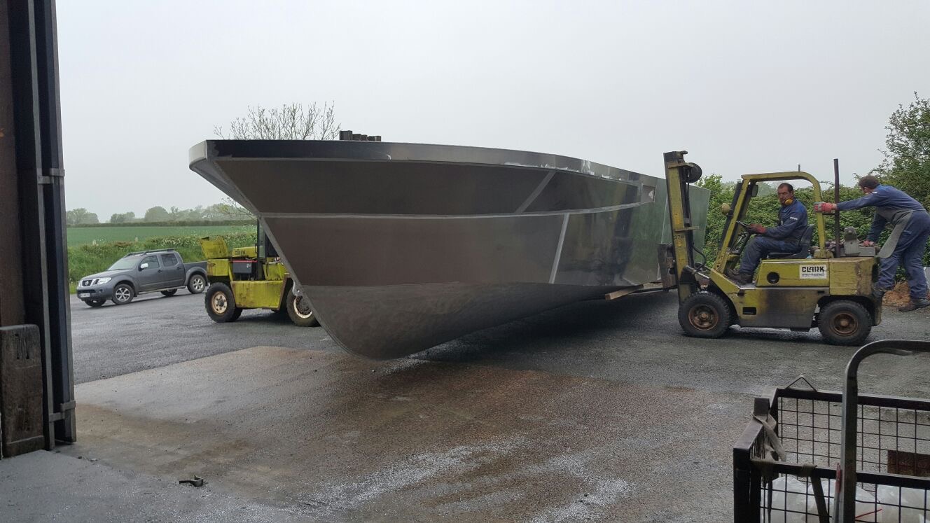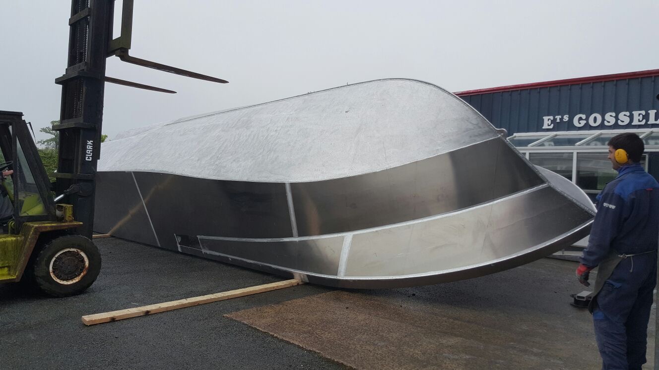 Mai : 2016 Retournement de la coque du futur bateau. Cette étape correspond au paiement du deuxième acompte. Eric St Martin visite en ce moment le chantier et en profite pour se rendre sur les plages du débarquement de 44.