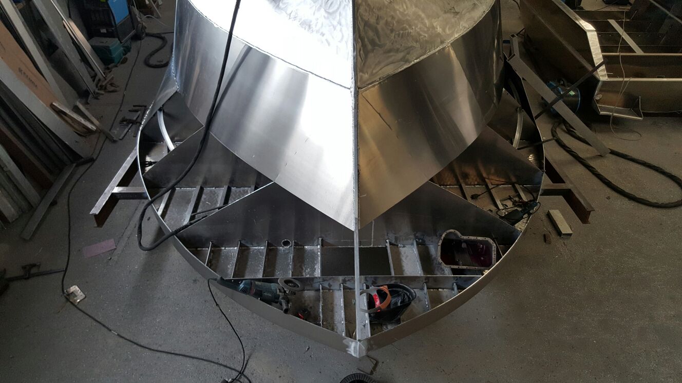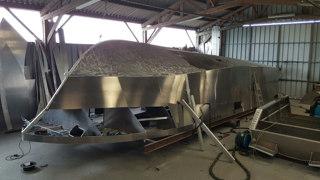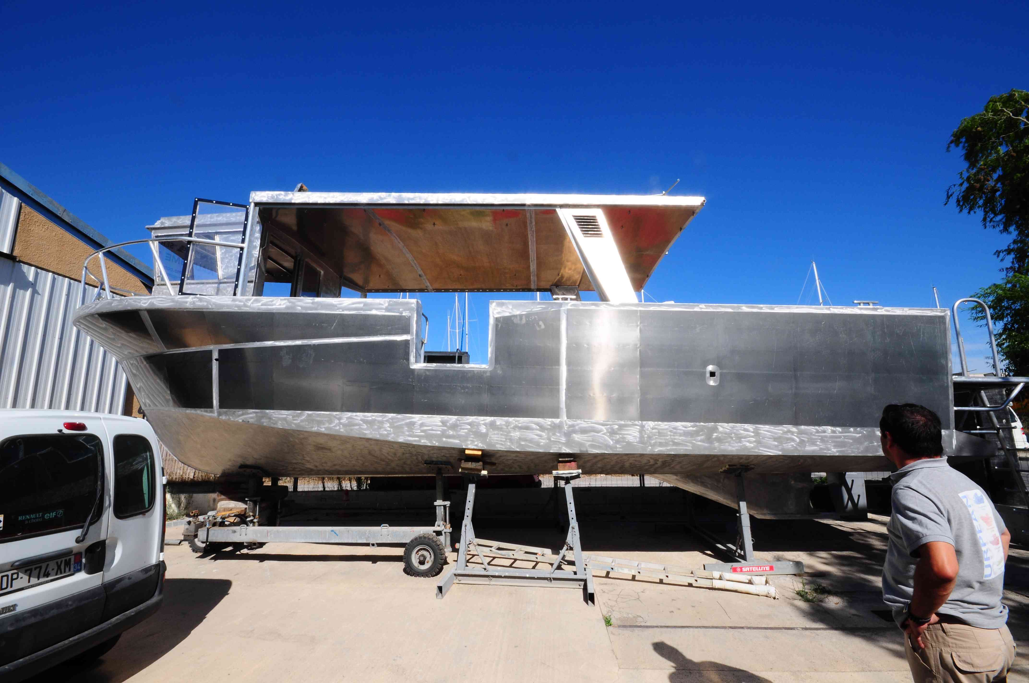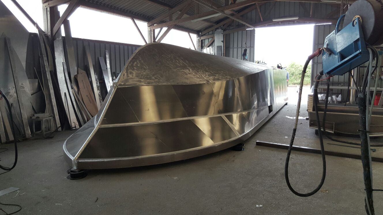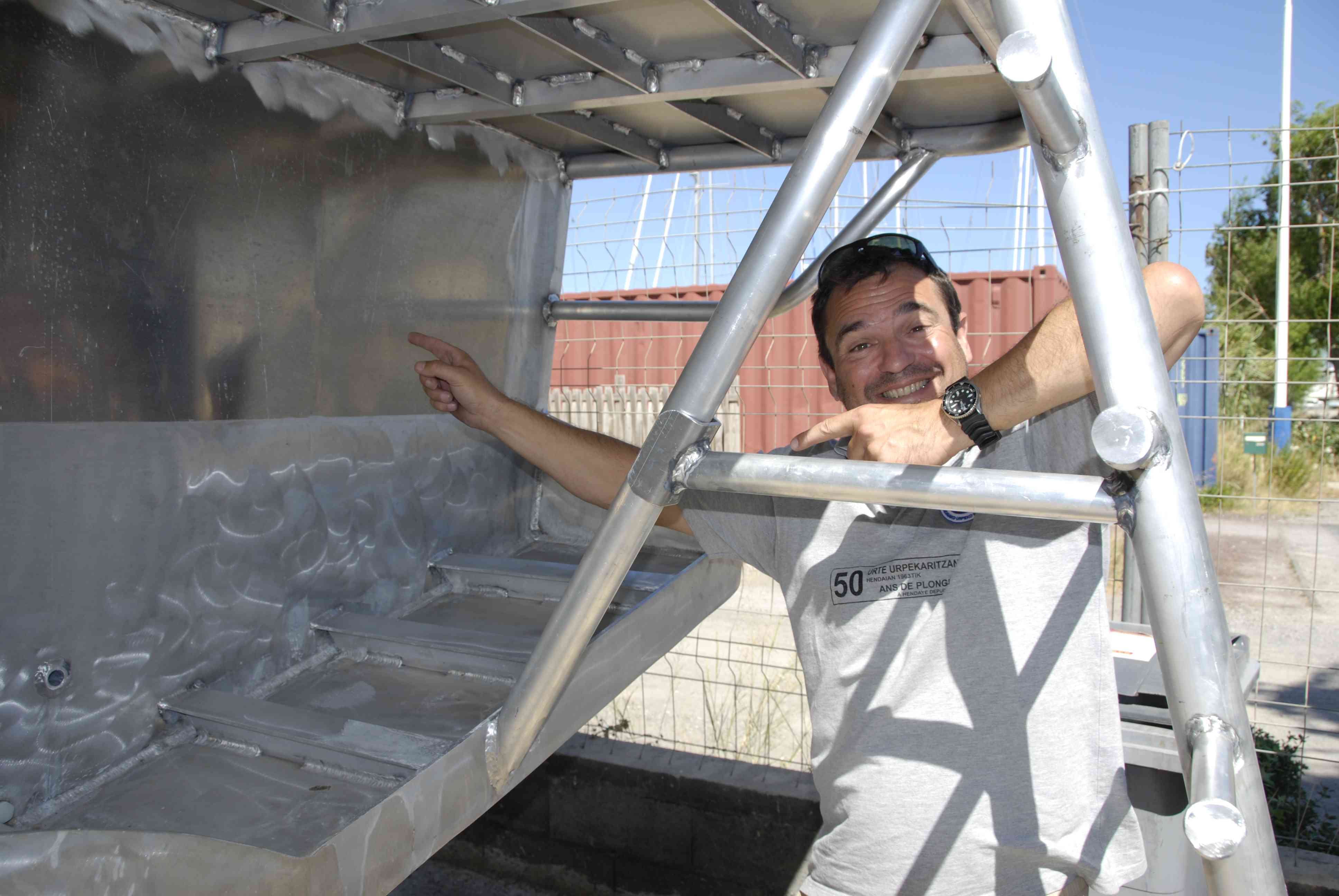 Mai : 2016 Retournement de la coque du futur bateau. Cette étape correspond au paiement du deuxième acompte. Eric St Martin visite en ce moment le chantier et en profite pour se rendre sur les plages du débarquement de 44.