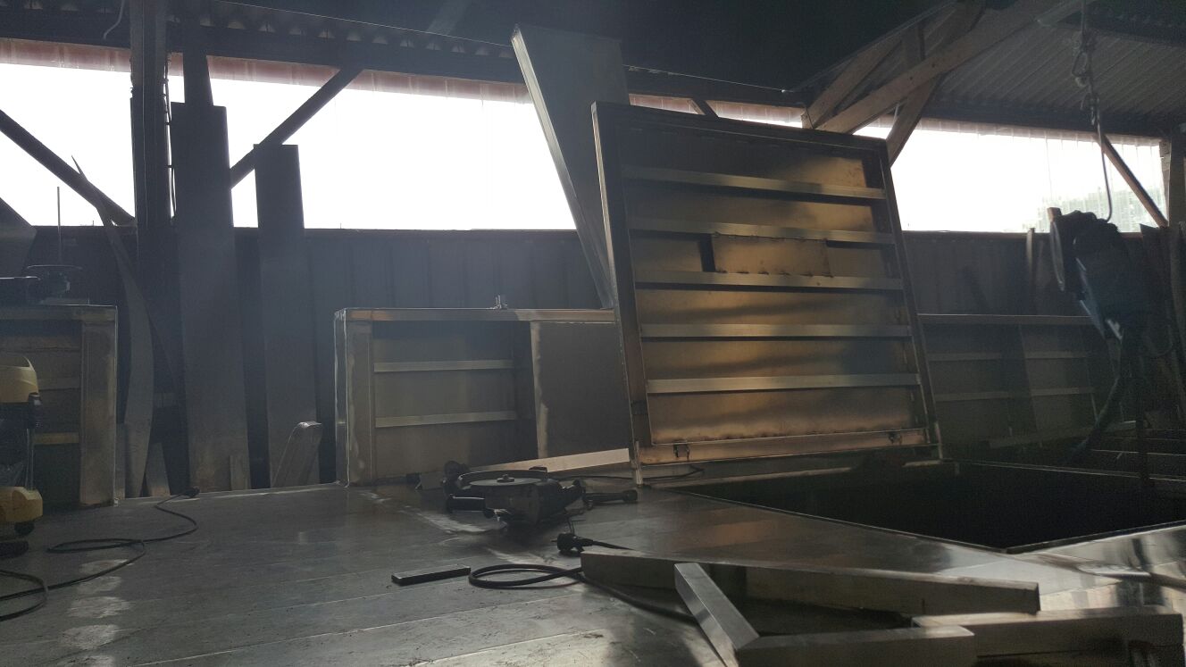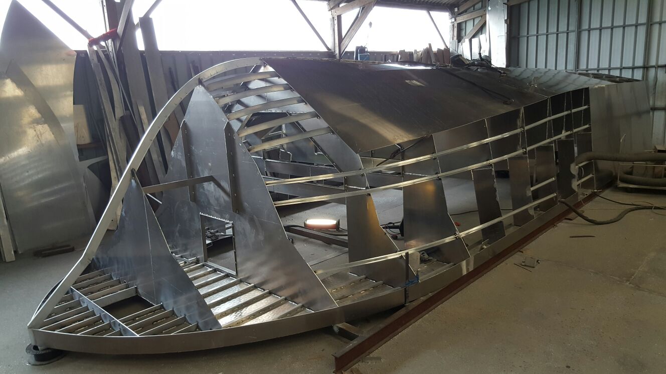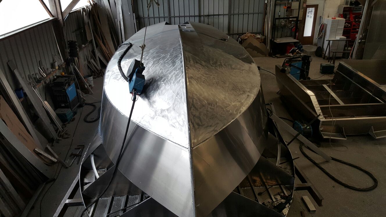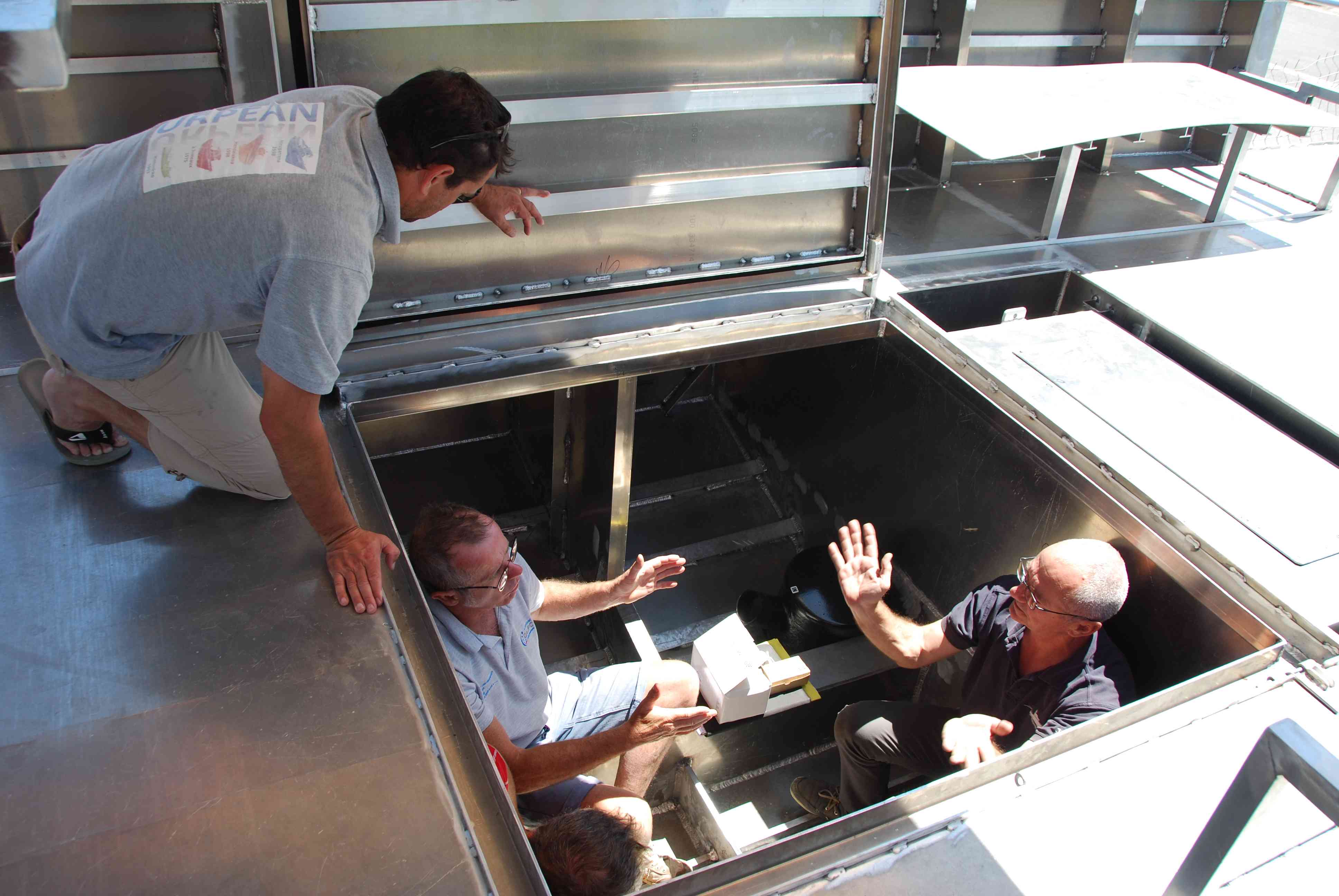 Mai : 2016 Retournement de la coque du futur bateau. Cette étape correspond au paiement du deuxième acompte. Eric St Martin visite en ce moment le chantier et en profite pour se rendre sur les plages du débarquement de 44.